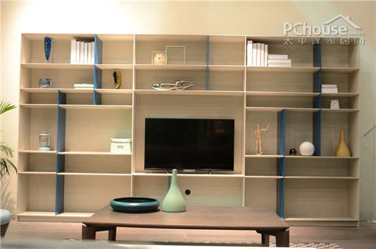 编辑点评:家居中,总是需要一些空间来满足不同物品的收纳需求。而在这个立体的电视柜里,设计师将蓝色立板把收纳空间分成不同的大小,满足不同物品的放置。