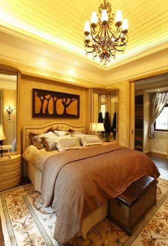 主卧,吊顶也是用了实木的木条,很有层次感的。地面也是铺了地毯,墙壁用的大部分是壁纸。床头两边都是手工做的床头柜,加了镜面装饰。