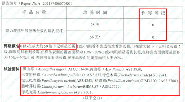 根据广东省微生物分析检测中心出示的报告显示,在GB/T 1741-2007《漆膜耐霉菌性测定法》的检测标准下,该款产品针对黑曲霉、黄曲霉、出牙短梗霉等8种常见的霉菌的长霉等级均为0级,达到国标中耐霉性能的最高等级。耐霉性能杠杠的!