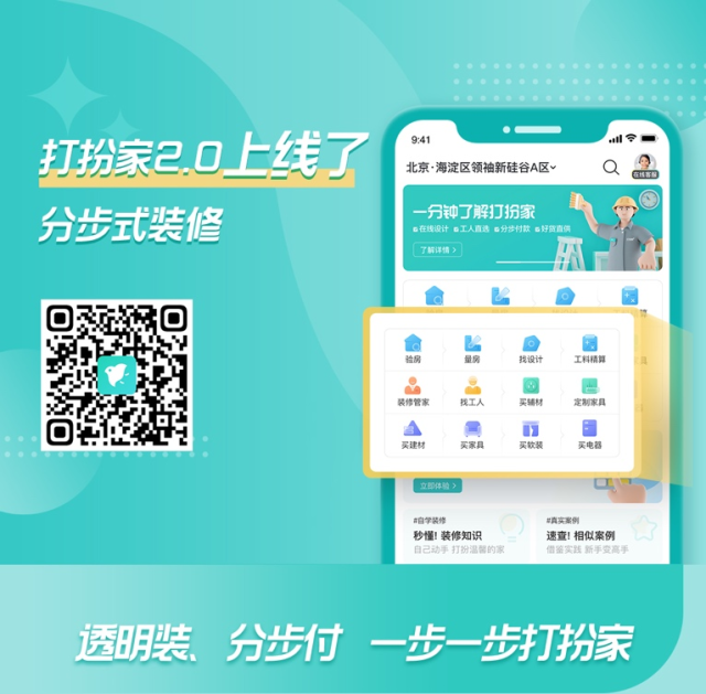 打扮家APP将装修前、装修中和装修后的服务拆解为n个标准化模块,将超过4400个问题节点全面覆盖。进入APP首页即可看到“金刚区”直观的展示了装修所有步骤:验房、量房、找设计、工料精算、找管家、找工人、买辅材、定制家具、买建材、买家具、买软装、买电器,12个步骤分段装修,分段验收付款。“分步付”更加清晰直接,提升用户安全感,降低消费风险。
