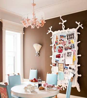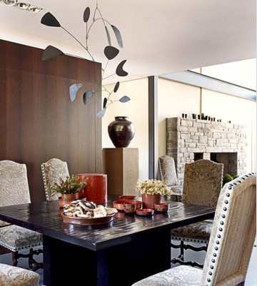 这个餐厅的视觉焦点莫过于其漂亮的木雕天花板,用木条勾勒出对称的图形,带有柔美曲线的餐椅迎合空间的整体风格,美式乡村不一定很敦厚很粗犷,也可以很柔情很优雅。