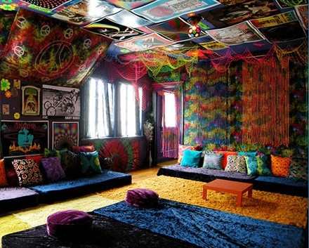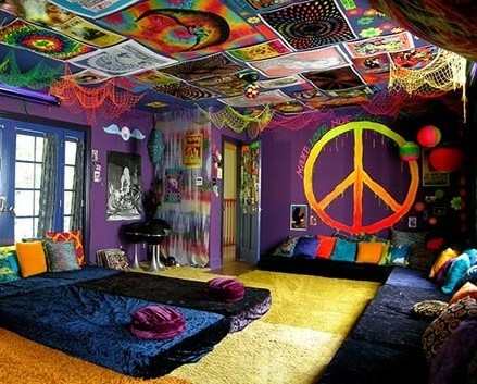两楼的卧室突破传统,带着些许嬉皮士风格中的自由主义。相比楼下的清新色系,这间卧室的色彩更加浓烈,紫色、亮蓝色,再加上一些浓烈的暖色调,把色彩的美发挥到极致。
