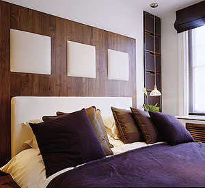 木板做成卧室背景墙,木板上三个白色的方格装饰与床头相互应。