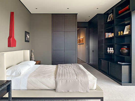 编辑点评:整个空间以素雅的风格为主,收纳柜把空间充分跳动起来,很干净利落。素雅的空间内,红色的墙上挂件非常抢眼,浅灰色地毯上架高的床,整个空间很平衡。