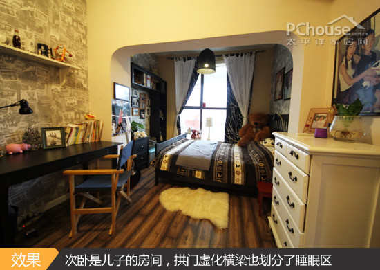 May的构思:次卧留给了儿子,格调以男孩喜欢的灰白格调为主,横梁经过修饰后形成拱形门廊,也为睡眠区作了分隔。