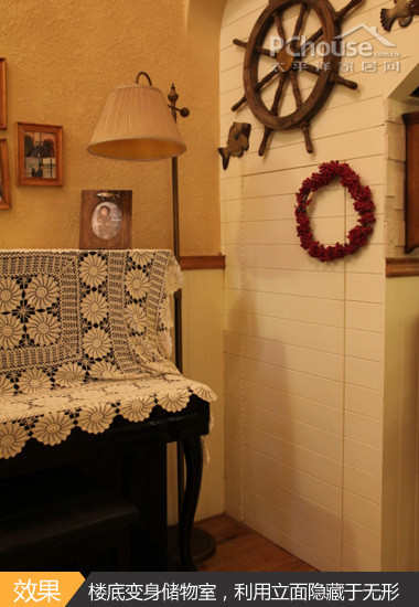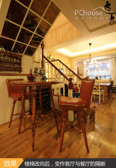 May的构思:楼梯走向改动后,梯下形成了三角小空间,May打造了一个美式乡村风格的小吧厅。梯底用灰镜+格栅设计增大空间感,May说客人都以为那是天窗。吧厅一角展示着May收集的红酒。