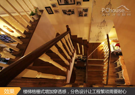 May的构思:楼梯的栏杆不是单一的,而是原木+白色相结合。因为上色需要分别细致包覆,May说当时上色的工人当时都做到叫苦连天了。楼梯格栅式栏杆,增加空间穿透感。