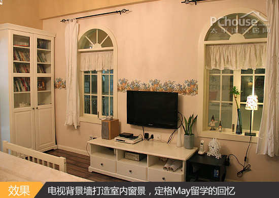 May的构思:主卧面积较大,May在电视背景墙上做了功夫。在瑞典留学其间,May爱上了瑞典的一切,她把每天早上起来的景色定格了,并搬到到自己的爱家。透过电视背景墙两扇对称的窗,她模仿出了瑞典的景致,每天早上起来,有置身于北欧的感觉。