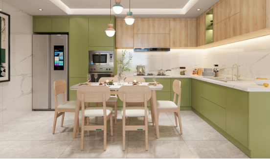在厨房设置智能升降柜和未来窗,只需轻轻触碰,就可控制吊柜的升降和开启,可以充分利用吊柜空间,老人、小孩都可以轻松使用。