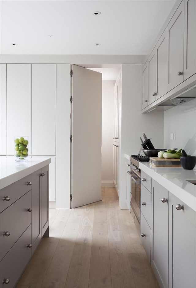 隐形门并不是真的隐形,而是让墙体和门体融为一体,没有门框、门锁,甚至没有把手,将门营造出一种看不见的状态。