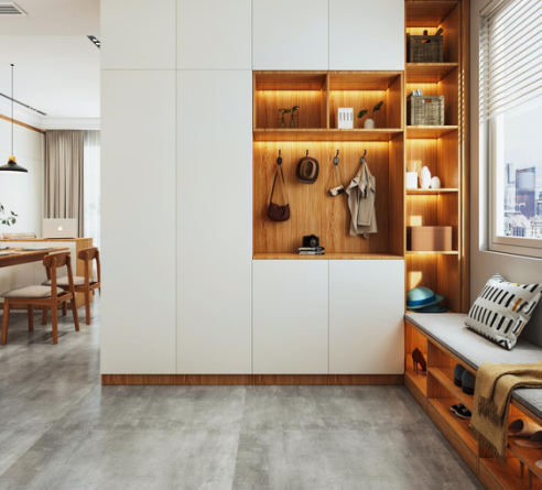 在玄关处定制卡座代替换鞋凳,下面做成开放格,不用开合柜门,就可以直接脱鞋换鞋。闭合式设计也可以收纳鞋油、鞋刷等物品,方便出门时打理。相比于独立的换鞋凳来说,卡座设计在视觉上也更完整统一,可以给客人留下一个好的第一印象。