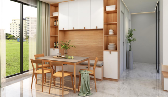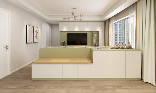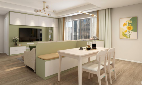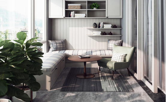 如果空间够大,还可以定制“L”型卡座,扩大休闲区域,配以桌子、绿植,再定制吊柜增加收纳,阳台就变成了一个独立的会客室,成为家里的一道靓丽风景线,时不时请三五好友来闲聊畅玩,享受欢愉的休闲时光。
