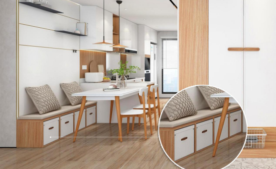 除了独立卡座,还可以和将卡座内嵌入餐边柜,做一体式设计。顶部定制吊柜,增加了储物量,两侧就做成开放式储物柜,存放盘子、杯子等物品。但是要注意,吊柜的深度要比卡座浅一些,防止起身撞头。