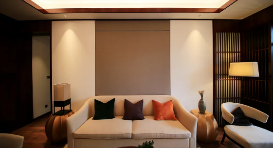如果是一家人到这里旅游,一定要来体验下这里的生活套房。当你推开门就可以看到这个“临时的家”比家还更像家,疲惫的身躯得到全身心安放。客厅顶上四方被暗藏着向上发光的灯带,瞬间拉高视觉层高,也增加了空间通透感。而天花两边对应深嵌射灯,利用其柔和的洗墙效果照亮了客厅的装饰物,并在靠窗边搭配着一盏柔和而不张扬的新中式落地灯,以及在沙发旁的边几上摆放着一盏传递东方美学的新中式台灯。如此灯光设计,第一视觉就打造出舒适安逸、宾至如归的进房体验,让中国人找到中国人的归宿感,让外国人感受中国人的家庭氛围。