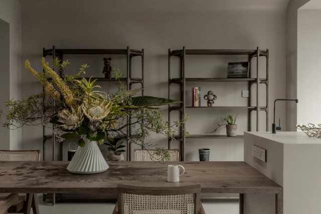 餐桌、书架、花卉、饰物.......细腻的材质搭配,创造出丰富的视觉感。设计师通过合理规划,使得美食空间得以承载居者各自的志趣和方式,又能促进彼此情感连接与交流。于此,人间风月、茶酒琴画的生活盎然展开。
