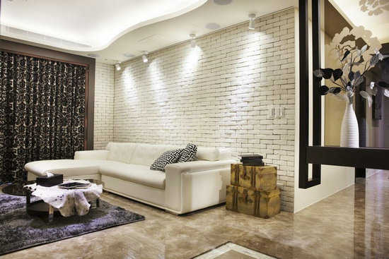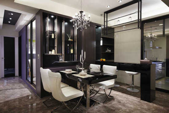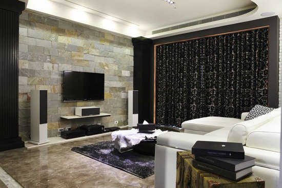 编辑点评:摆脱单层次的屏风设计,渐层式的安排遮掩住电视主墙存在,对向镂空设计转圜出入室动线变化。