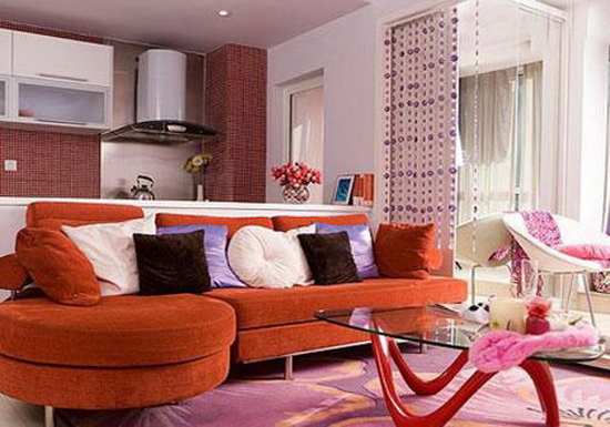 打通客厅和餐厅,让两个空间都拥有更宽敞的视觉,而开放式的设计也是近年来最流行的室内设计。明亮的橘红色沙发搭配充满设计感的小茶几,原本小小的客厅变得非常耀眼。你也可以尝试1个小空间+另一个小空间的设计,得到>2个小空间的神奇效果。