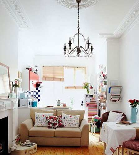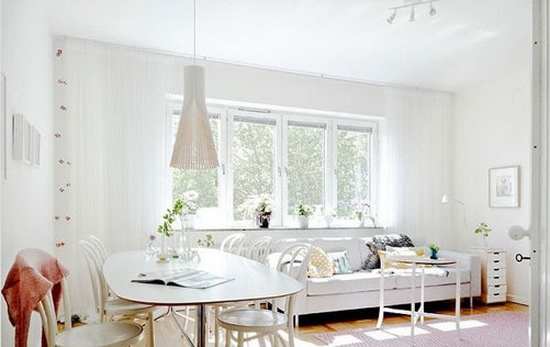 纯净的用色是扩展小户型客厅面积的方案之一,让客厅加入更多的新鲜空气,我们不要吝啬墙面区域,多开几扇窗户吧,你要相信明媚阳光对两人甜蜜生活的诱惑力。茶几的选用只是一个轻巧的四角小圆桌,从而给客厅预留了更多的使用空间。简易线条的餐桌和素雅纸质吊灯的参与,让客厅显得更加轻盈灵动。