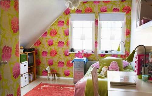 女孩总喜欢粉粉的世界,把墙面用红色花朵图案壁纸进行装饰,搭配红色的地毯,整个卧室甜蜜又青春。斜面下的空间不能浪费,可以买个小型的收纳架,解决收纳问题的同时,也让低矮的斜面在视觉上变得高大。