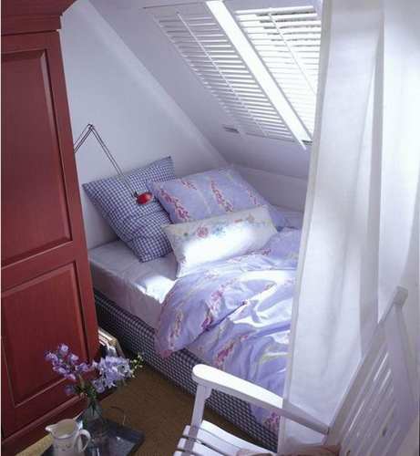 很多在大城市打拼的朋友都租住过小阁楼,因为它便宜。像这样只有三四平米的小空间,如何才能布置出卧室的温馨`2;因为空间太小,保持白色墙面不要改动,这样会让视觉上显得宽敞一些。把床沿着斜面安放,虽然有点压抑,好在不影响睡觉。床边放个白色的木椅,平时看书品茶可就靠它了。