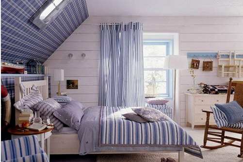 蓝色的布艺格子一扫斜面屋顶的压抑,换来清新大方英伦风。床品、坐垫、抱枕、窗帘全都使用蓝白条纹布艺装饰,整个空间清新淡雅,让人心旷神怡。悠闲的时候,坐在旧摇椅上发呆也好,看书也罢,都很惬意。