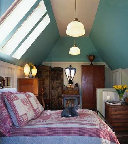 浓重色彩的波西米亚风格也可以在阁楼上演。把斜面屋顶刷成哑光绿色,搭配暗红色的床品,这个空间立即活泼起来。两盏吊灯发出温馨的暖黄色,给人舒适的居住体验。