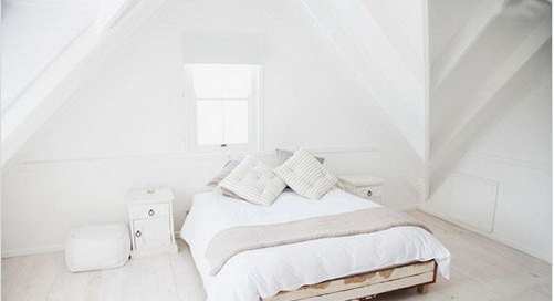 只有一扇小窗的阁楼不免光线昏暗,当所有墙面和地板、床品、床头柜都换成白色,这个空间是不是瞬间变得明亮起来。可以在床上放些麻色布艺进行色彩中和,避免卧室过于单调。