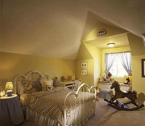 把阁楼改造成孩子的卧室,大大的铁艺床可以伴随孩子整个成长过程,皇冠状的床架既有童趣又充满浪漫气息。窗台上方的屋顶原本奇形怪状,在涂上暖黄色的涂料之后,却又有棱有角,很有立体感。把飘窗改造成孩子的私享“动物园”,把各种毛绒玩具都集中在这里,很有意思,也让房间更齐整。