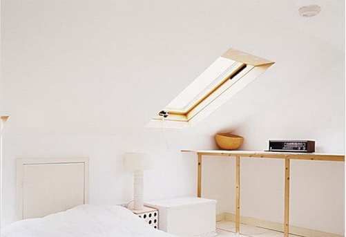 继续用大面积的白色营造舒爽的视觉,斜面的“天窗”采光也不错。用原木制作而成的小桌既是书桌,也是装饰架。