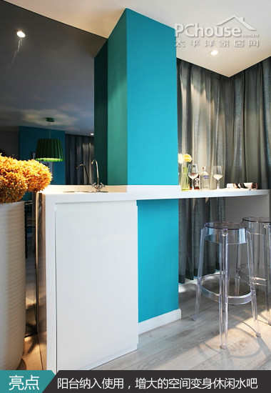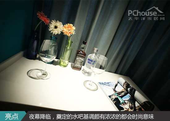 小编解释:在只有8.5m²平方米的空间里,餐厅也打造了水吧。原因是餐厅整体利用了阳台的空间,设计师满足COCO品茶会友的需求,在与餐厅相对的落地窗角落打造水吧,水吧蓝色柱子与餐厅相呼应。拉开布帘,便是一片璀璨的城市夜景。