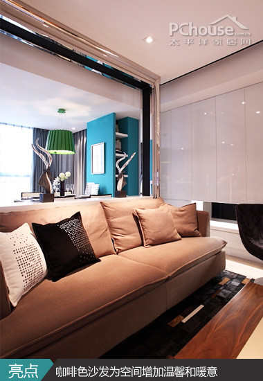 小编解释:COCO喜爱雅致的蓝色设计,房子整体采用蓝色,但需有暖色调作调和,咖啡色沙发在这里起到了很好的色彩调和功能,一字型沙发占用空间不多,留出左侧过道进入餐厅。