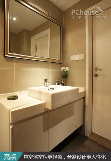小编解释:悬空的浴室柜设计增加收纳功能,也比地柜更显轻盈;外凸的台盆防止人往浴室柜门靠拢而碰伤双脚。