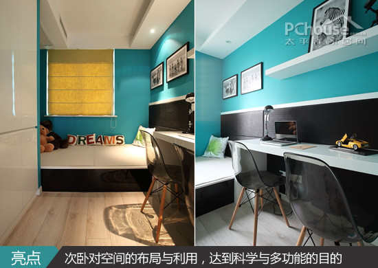 小编解释:次卧设计简约,睡眠区地台升高,可作为客房或以后的儿童房使用。规划睡眠区后,剩余的方正空间,一侧设置衣柜,一侧设置简易书桌,也可作小两口临时书房之用。