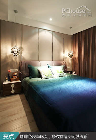 小编解释:主卧吊灯没有使用大吊灯,换以两盏垂坠的小水晶置于两则床头,水晶灯不压顶,卧室整体显得轻盈。