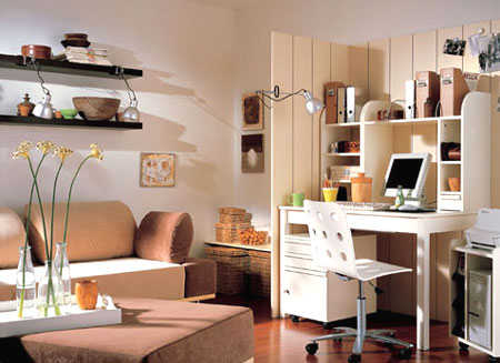 在大气的客厅里很巧妙的融入了一个充满知性的书房,房间虽小,功能却很齐全;陈设虽多,却丝毫不显得杂乱,看来主人在布置时还是很下了一番功夫的。