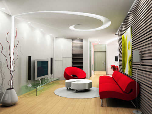 弧线造型的顶灯给人以强烈的视觉冲击力,整个房间的布置颇有几分后现代的风格,但最抢眼的还要数造型别致的红色沙发。