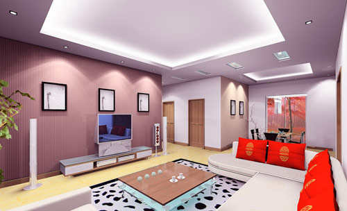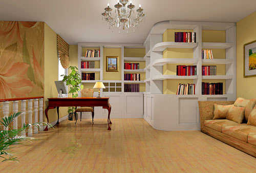 这似乎是一间还未布置完成的客厅,但已经被布置得很有特点了。客厅一角多出来的空间可以当书房使用,而廊柱样式的壁画延伸了人的视界,无形中扩大了客厅的空间。