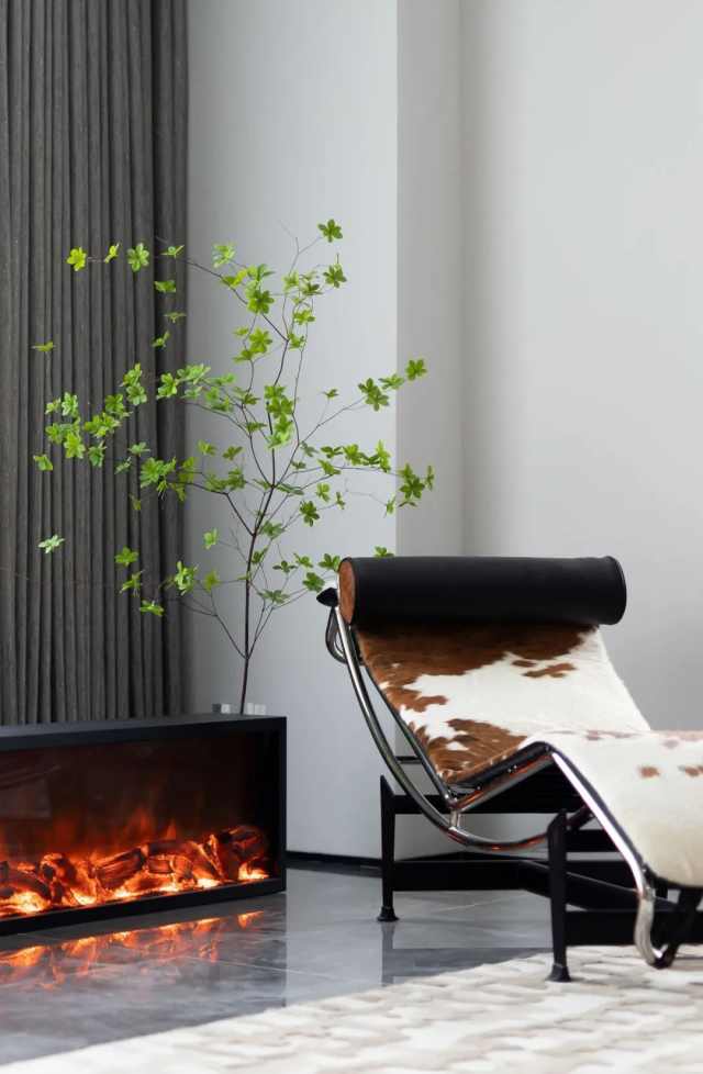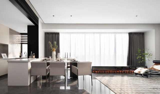 设计师选用富有质感的冷色系铺陈空间的安静情绪。此刻,卸下疲惫,坐于沙发对望窗景,品上一杯红酒,抑或悠闲地躺在皮毛装饰摇椅上看书、休憩,摩登时尚的生活气息于此尽数演绎。