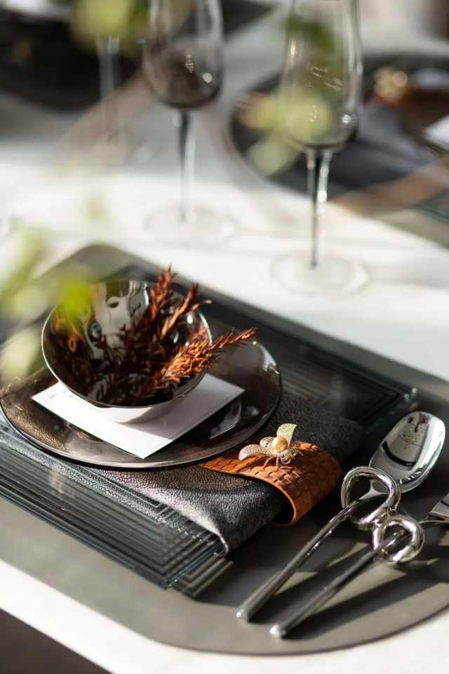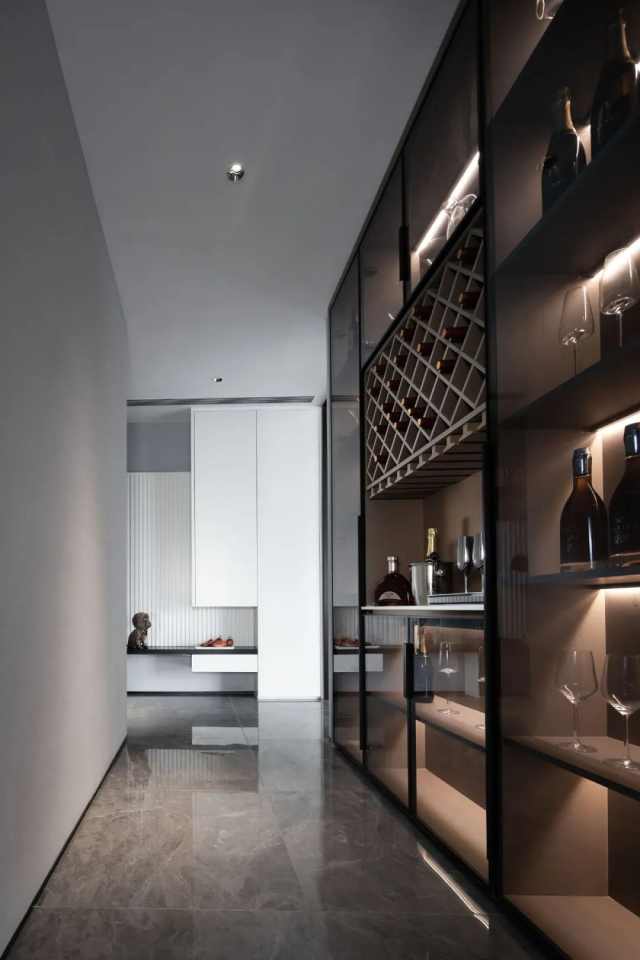 考虑到空间的格局及动线,设计通过临窗而设的开放式餐厅,完美衔接客厅的社交场景与转角处的玻璃酒柜,情感的联结与流动,在由场景设计搭建起的氛围中,愈加饱满而真实。