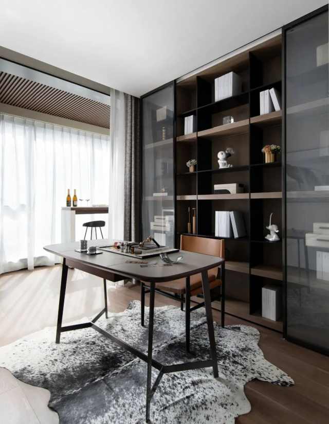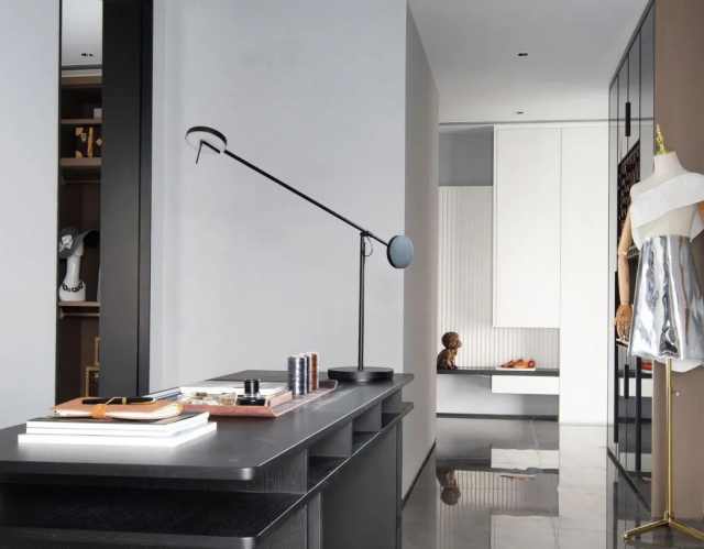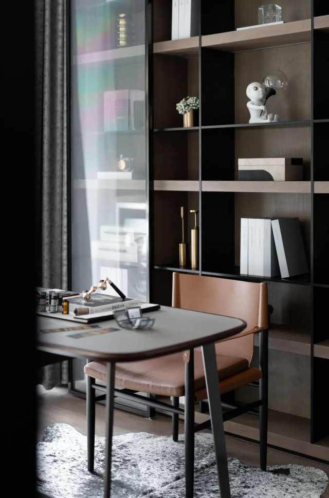 步入书房,映入眼帘的是一面原木色隔层柜架,可供居者根据其喜好自由展陈。随着视线的转换,置于书桌上的胶卷与镜头、窗前的大理石高脚吧台,演绎了一个爱好生活与艺术的摄影族角色,一幕幕鲜活的生活场景于此浮现,丰富而充实。