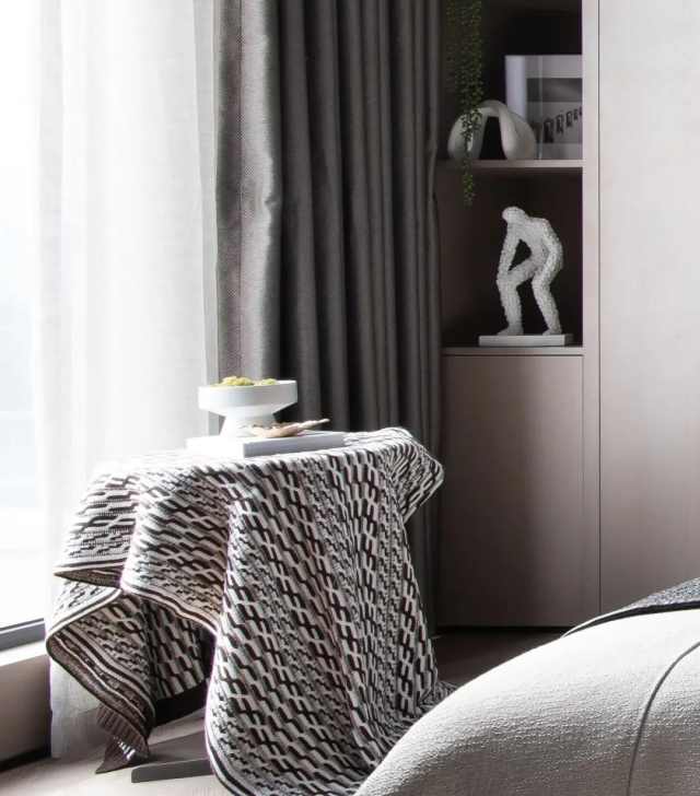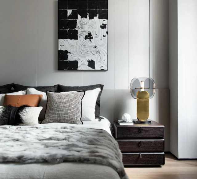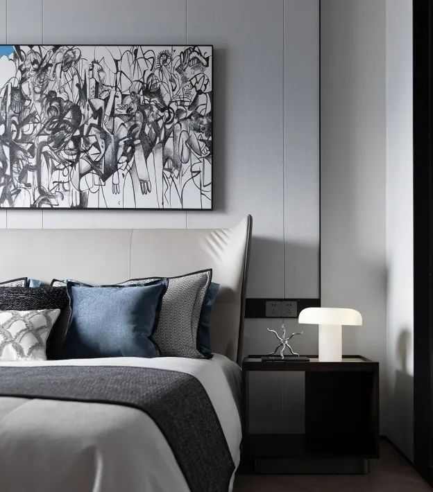 一幅挂于墙面的抽象艺术画,添入一分清幽的湖蓝,呼应着主卧的整体配色。在场景的分割中,居者或躺在飘窗处享受阳光的暖意,或坐于桌角旁的简灰座椅上喝着咖啡、看书、发呆,生活的闲与趣、雅与意在这里交织共存。