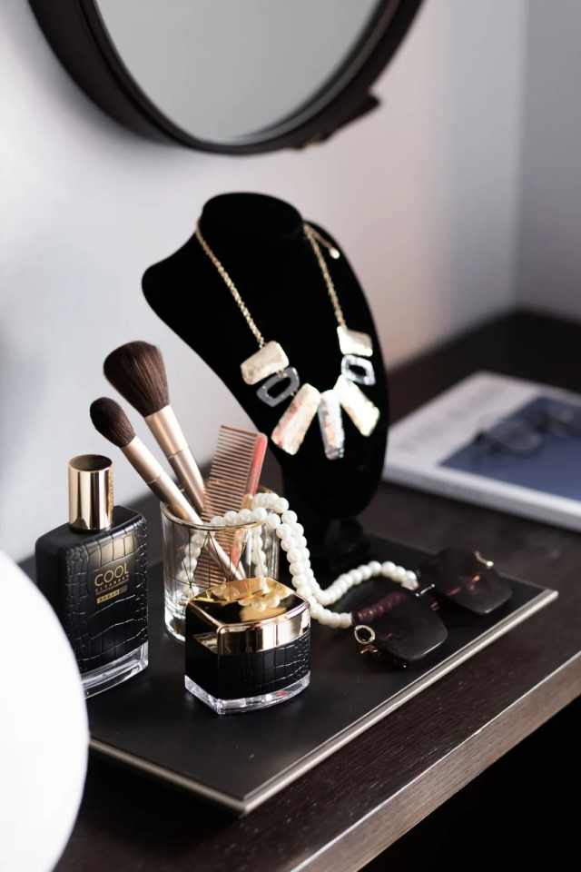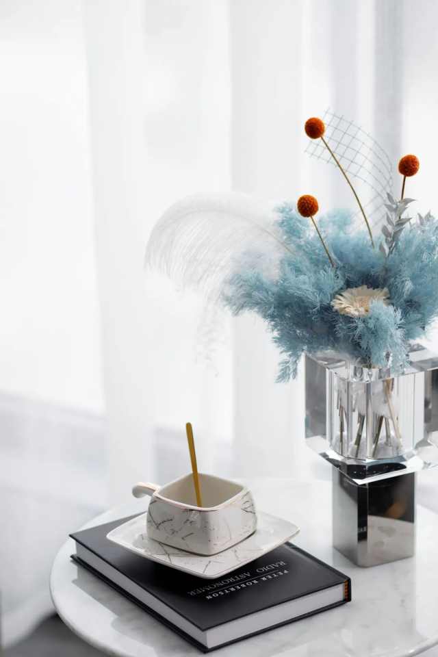 在对审美有着严苛要求的女主人眼中,服装设计是她生活中重要的一部分。造型简约独特的凳几与桌面的情景布置,加之一角处的克莱因蓝艺术装置,集合着摩登的质感与时尚的品味,亦绽放出属于现代都市女性的个性与魅力。