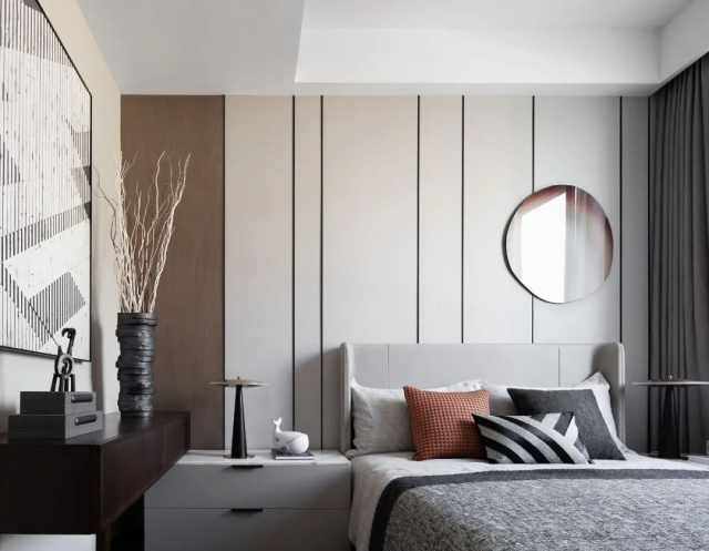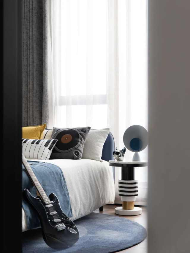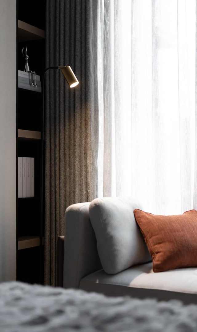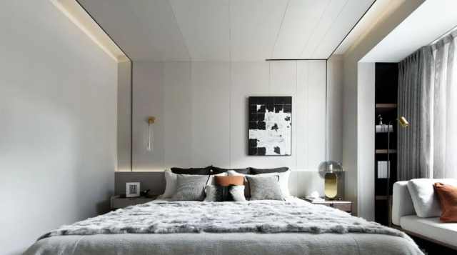 长辈房的布置大气端然,设计规避了冗余的铺叙,择取舒适的棉麻为主材质,缀以灵动的银色墙饰、流线型金属灯具,让原本素朴的空间不失精致态度。