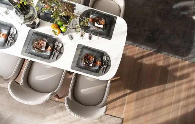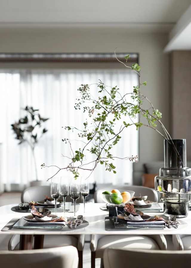 对繁忙都市人来说,与家人间的三餐四时,或在厨房里专心烹饪,是一段愉快而自在的体验。步入餐桌,精致有序的餐具与果盘、抽象的红色艺术装饰、金属花器中的嫩绿枝叶,升华为对美与体验的享受。而当视线转至简洁的中厨区,温柔的暖白笼罩于一室,填满了对认真生活的美好希冀。