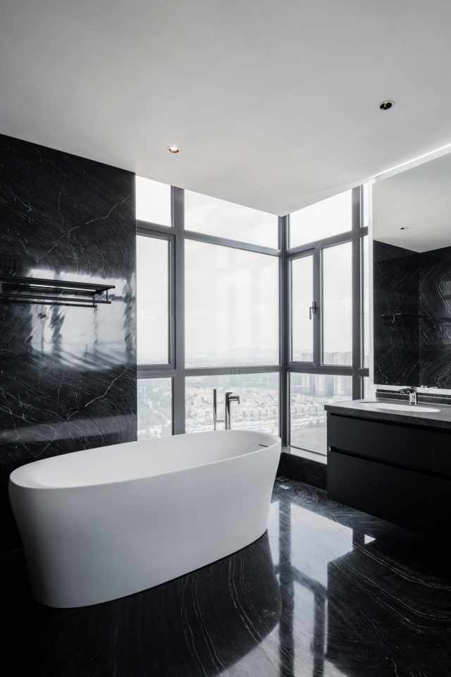 优雅纯白的落地浴缸、神秘经典的黑金大理石墙地面、可以俯瞰万家灯火的唯美落地窗......结束了一天的工作,在这里泡个澡,便可卸下一天的疲惫,静静享受此刻的从容与闲适。