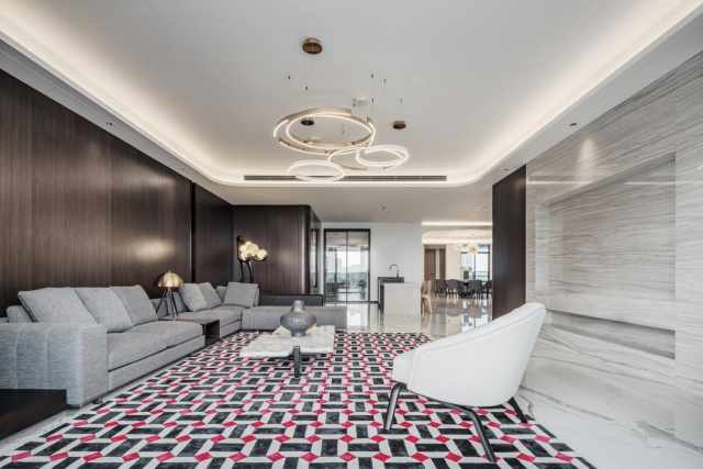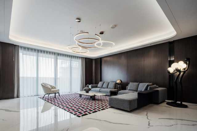 客厅选用了大量深棕色的木为主色调,浅棕与乳白交相辉映,大量经典的石材和经典款家具让空间更有质感。红黑白的格纹地毯时尚又经典,隐藏式灯带将优雅轻松的气氛渲染起来,浅灰色沙发搭配一盏人形落地灯,氛围感十足。