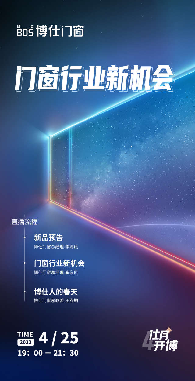 门窗行业千亿蓝海还有哪些新机遇?5年实现10倍的快速增长,博仕门窗一路“开挂”的秘密又是什么?4月25日晚上7点,以“门窗行业新机会”为主题的「博仕门窗直播活动」火热开启,你想知道的答案就在这!