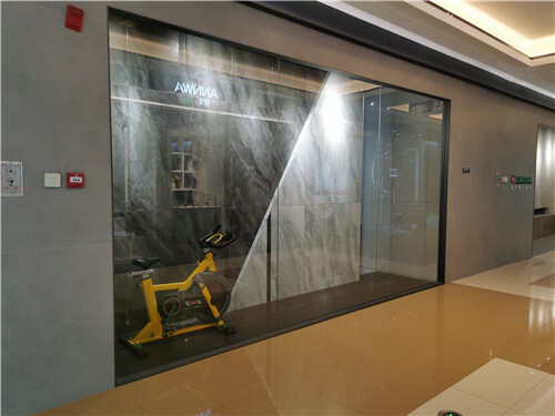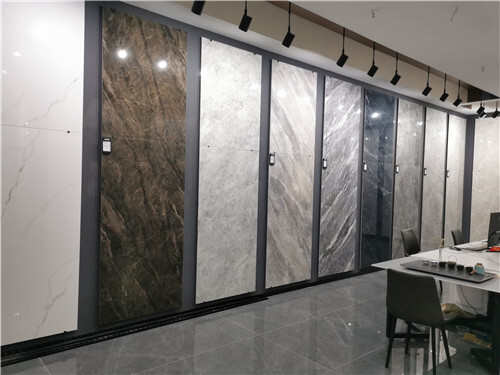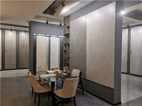 人对空间的感官,自视线相接那一刻便开始了。设计师制造一种空间体验,不如说是制造一种表达了某种美学阈值的视觉互动,不断吸引过往行人。在店门口,以自带高级感的深灰为底色,搭配白色的广告语,超大5连纹、无限拼接纹理1200x2400mm「威尼斯雪花白GLX67」,创造磅礴大气的惊艳视野。