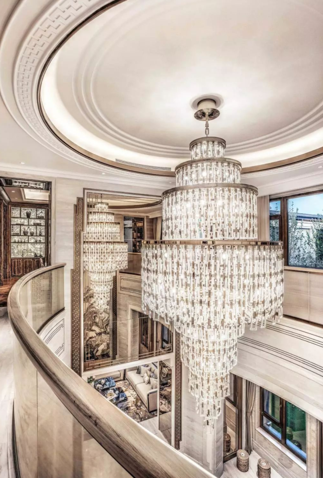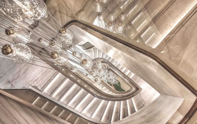 楼梯间灯饰取自孔明灯的灵感,孔明灯一般在元宵节、中秋节等重大节日施放,表达祈望幸福的寓意。