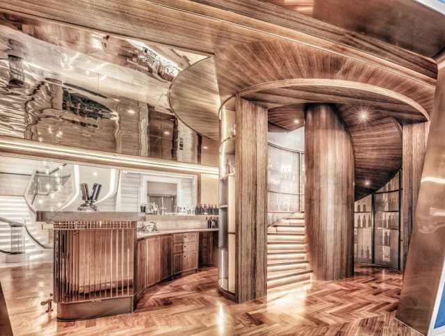 材质运用上,在墙面、地面、垭口处大面积选用纹理优美、光泽柔和的欧亚木纹石材,这些反映山纹、水纹、地纹的天然材质的出现,模拟了船行之感——山影后移和水纹波动都为空间营造出“忽闻海上有仙山,山在虚无飘渺间”的诗画情境。